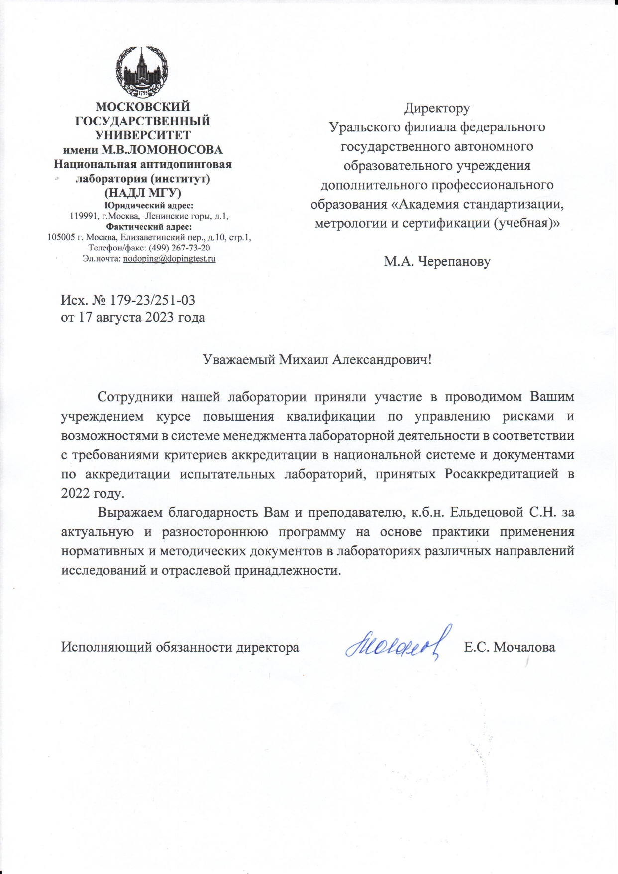 Благодарность Национальной антидопинговой лаборатории МГУ