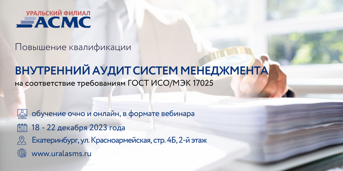 Уральский филиал АСМС проведет повышение квалификации в области организации внутренних проверок систем менеджмента руководителей и специалистов предприятий на тему: