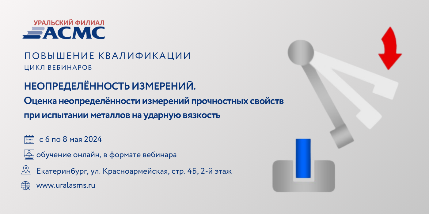 Уральский филиал АСМС проведет повышение квалификации для руководителей и специалистов испытательных лабораторий, специализирующихся на разрушающих методах испытаний на тему: «Неопределенность измерений. Оценка неопределенности измерений прочностных свойств при испытании металлов на ударную вязкость», 20 академических часов.