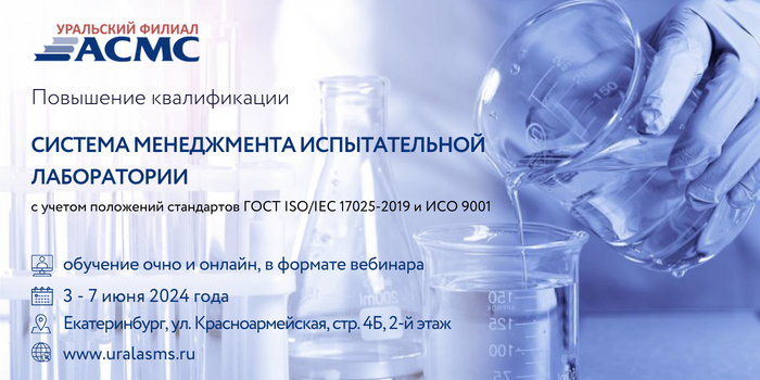 Уральский филиал АСМС проведет повышение квалификации для руководителей и сотрудников испытательных лабораторий, менеджеров по качеству на тему: «Система менеджмента испытательной лаборатории (с учетом положений стандартов ГОСТ ISO/IEC 17025-2019 и ИСО 9001)»,(36 академических часов)