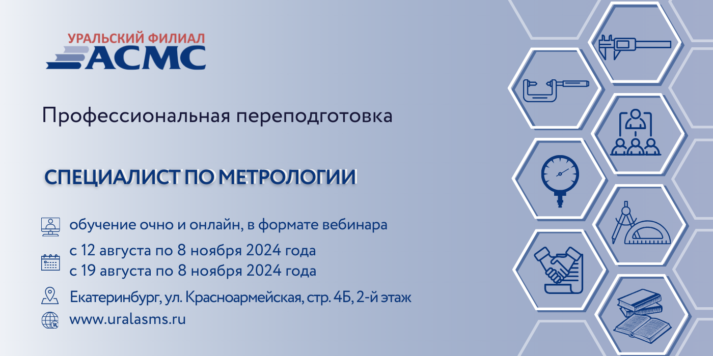 Уральский филиал АСМС проводит дополнительную профессиональную программу «Специалист по метрологии», предназначенную для переподготовки специалистов метрологических служб по направлению «Поверка и калибровка средств измерений».