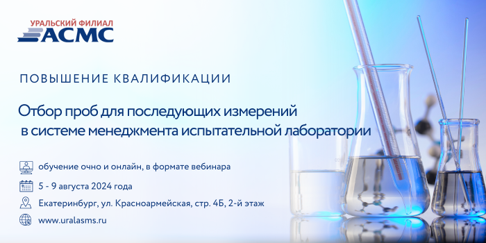 Уральский филиал АСМС проведет повышение квалификации для специалистов лабораторий, которые занимаются отбором проб для последующих измерений на тему: «Отбор проб для последующих измерений (испытаний) в системе менеджмента испытательной лаборатории», 36 академических часов.