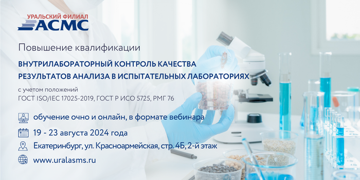 Уральский филиал АСМС проведет повышение квалификации для руководителей и сотрудников испытательных лабораторий, менеджеров по качеству на тему: «Внутрилабораторный контроль качества результатов анализа в испытательных лабораториях (с учетом положений ГОСТ ISO/IEC 17025-2019, ГОСТ Р ИСО 5725, РМГ 76)», 36 академических часов.