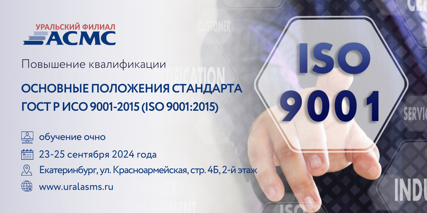 Уральский филиал АСМС проведет повышение квалификации для менеджеров по качеству, руководящих работников и специалистов хозяйствующих субъектов сферы производства (работ, услуг), занимающиеся разработкой, внедрением и подготовкой к сертификации систем менеджмента качества, на тему: «Основные положения стандарта ГОСТ Р ИСО 9001-2015 (ISO 9001:2015)», 20 академических часов.