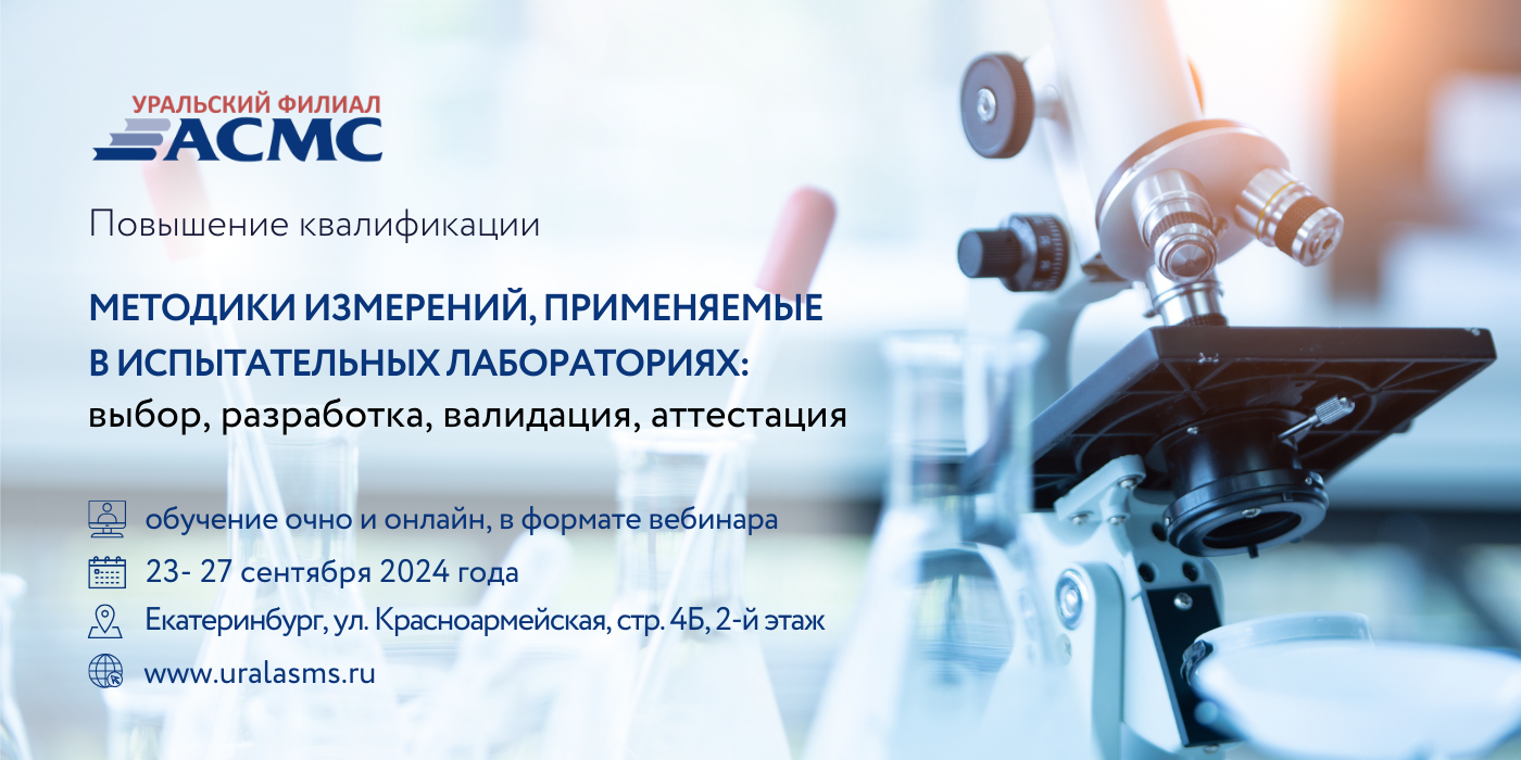 Уральский филиал АСМС проведет повышение квалификации для специалистов лабораторий, промышленных производств, системы охраны окружающей среды, нефтепромышленного комплекса на тему: «Методики измерений, применяемые в испытательных лабораториях: выбор, разработка, валидация, аттестация (с учетом требований ФЗ "Об обеспечении единства измерений", Приказа Минпромторга №4091 от 15.12.2015, положений ГОСТ ISO/IEC 17025-2019, ГОСТ Р 8.563, ГОСТ Р ИСО 5725, РМГ 61), 36 академических часов