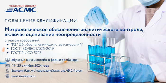 Уральский филиал АСМС проведет повышение квалификации для специалистов лабораторий, выполняющих аналитические работы в области оценки соответствия на тему: «Метрологическое обеспечение аналитического контроля включая оценивание неопределенности», 72 академических часа.