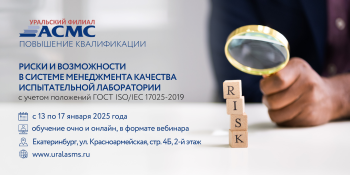 Уральский филиал АСМС проведет повышение квалификации для руководителей, специалистов испытательных лабораторий, выполняющих испытания продукции, материалов (веществ) в различных видах экономической деятельности на тему: «Риски и возможности в системе менеджмента качества испытательной лаборатории (с учетом положений ГОСТ ISO/IEC 17025-2019)», (36 академических часов)