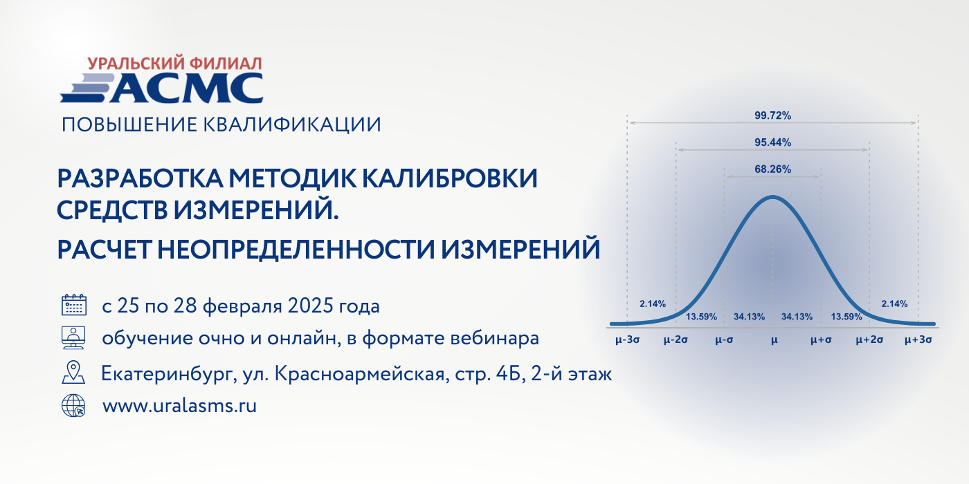 Уральский филиал АСМС проведет повышение квалификации для руководителей и сотрудников промышленных производств и испытательных лабораторий на тему «Разработка методик калибровки средств измерений. Расчет неопределенности измерений», 36 академических часов.