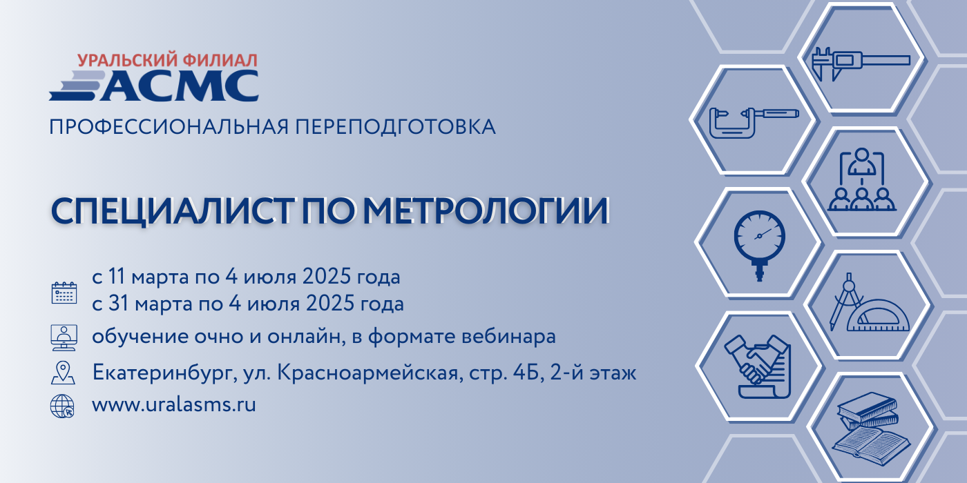 Уральский филиал АСМС проводит дополнительную профессиональную программу «Специалист по метрологии», предназначенную для переподготовки специалистов метрологических служб по направлению «Поверка и калибровка средств измерений».