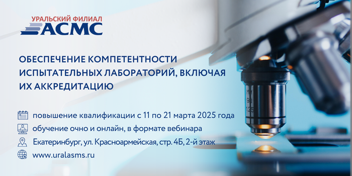 Уральский филиал АСМС проведет повышение квалификации для руководителей и сотрудников испытательных лабораторий, менеджеров по качеству на тему «Обеспечение компетентности испытательных лабораторий, включая их аккредитацию», 72 академических часа.