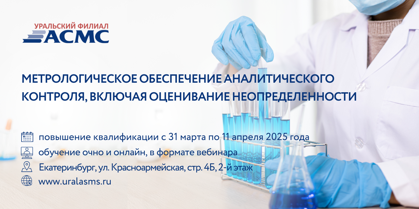 Уральский филиал АСМС проведет повышение квалификации для специалистов лабораторий, выполняющих аналитические работы в области оценки соответствия на тему «Метрологическое обеспечение аналитического контроля, включая оценивание неопределенности», 72 академических часа.