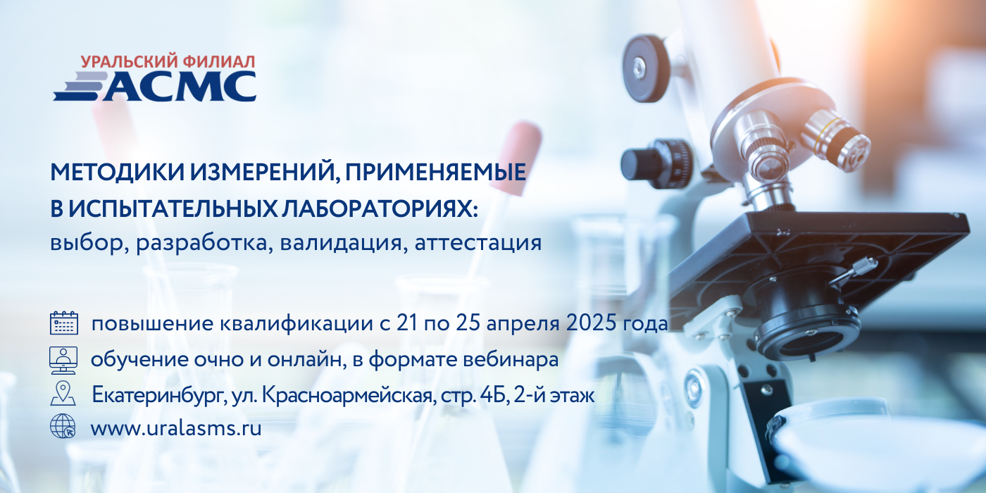 Уральский филиал АСМС проведет повышение квалификации для специалистов лабораторий, промышленных производств, системы охраны окружающей среды, нефтепромышленного комплекса на тему «Методики измерений, применяемые в испытательных лабораториях: выбор, разработка, валидация, аттестация», 36 академических часов