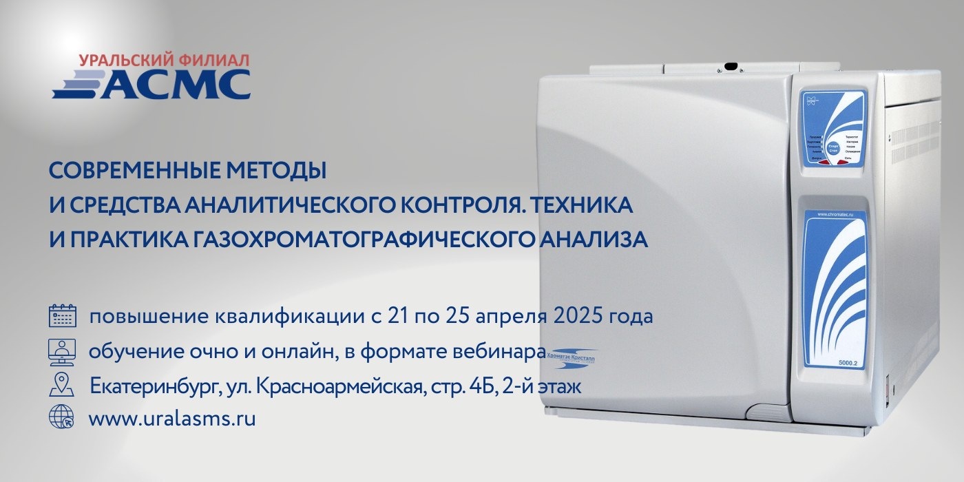 В Уральском филиале АСМС пройдет повышение квалификации специалистов, проводящих поверку и обслуживание хроматографов различных типов на тему «Современные методы и средства аналитического контроля. Техника и практика газохроматографического анализа», 36 академических часов