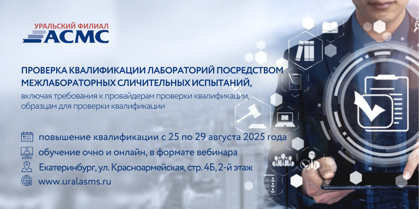 Уральский филиал АСМС проведет повышение квалификации для специалистов испытательных, аналитических лабораторий – потребителей услуг провайдеров проверок квалификации на тему «Проверка квалификации лабораторий посредством межлабораторных сличительных испытаний, включая требования к провайдерам проверки квалификации, образцам для проверки квалификации», 36 академических часов.