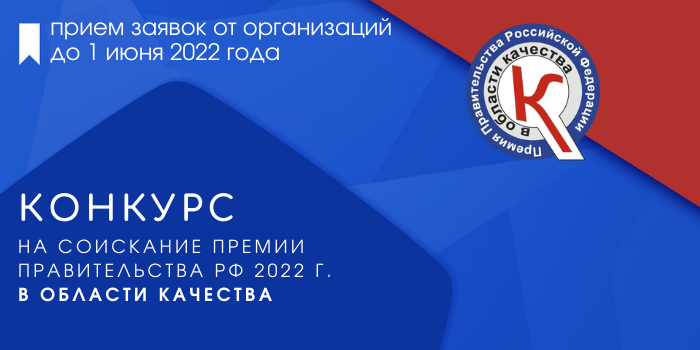 Объявлен очередной 26-й конкурс на соискание премий Правительства Российской Федерации в области качества, которые присуждаются организациям за достижение значительных результатов в области качества продукции и услуг, а также за внедрение высокоэффективных методов менеджмента качества.